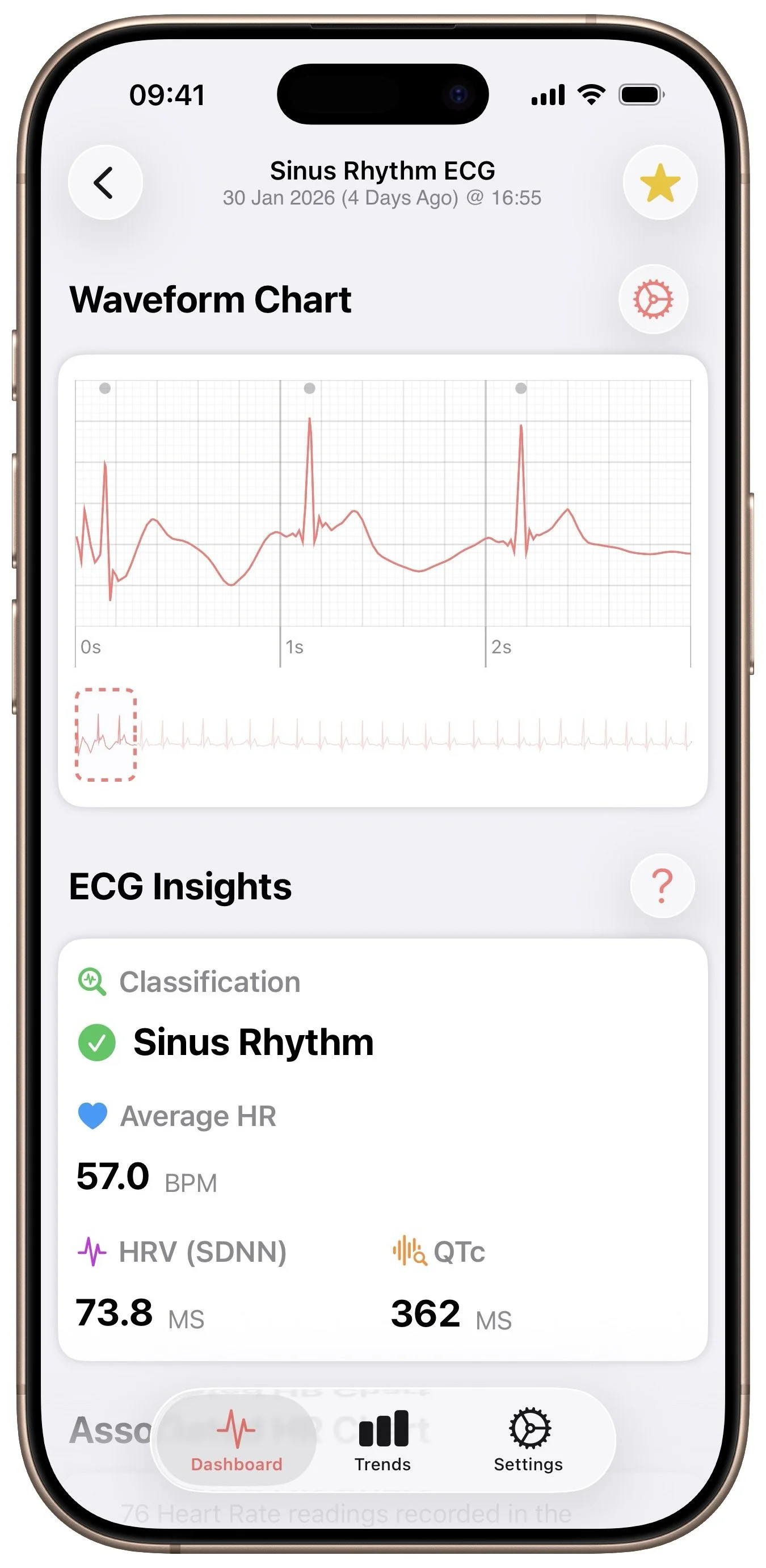 Browse and review all Apple Watch ECG recordings in one place, complete with waveforms, classifications, and supporting details for easy comparison over time.