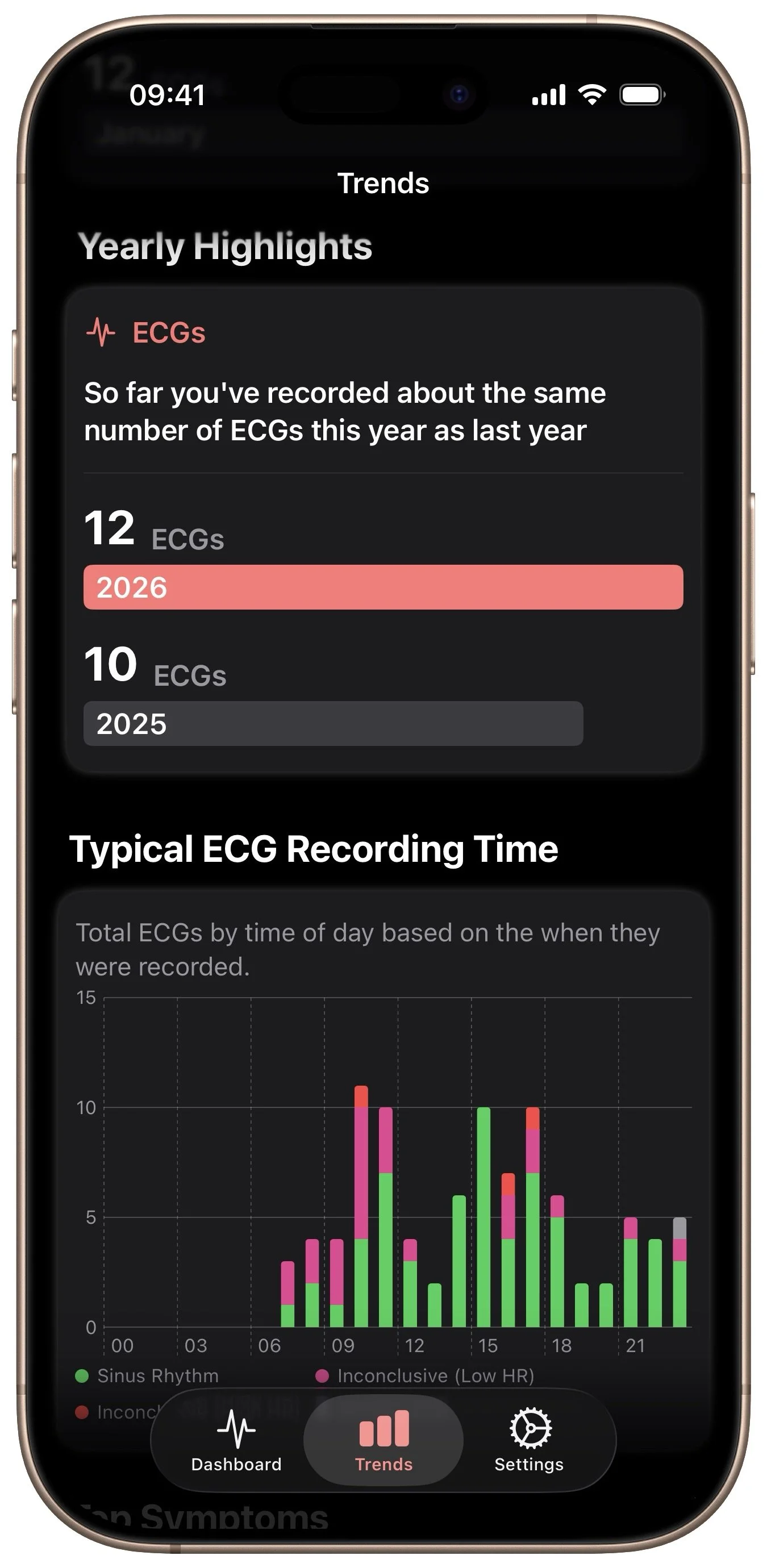 While Apple Health provides access to individual ECG recordings, ECG Analyzer is built around context. The app allows users to view ECGs alongside symptoms and personal notes, explore longer-term patterns across recordings, and generate clean, multi-ECG reports designed to support conversations with clinicians.