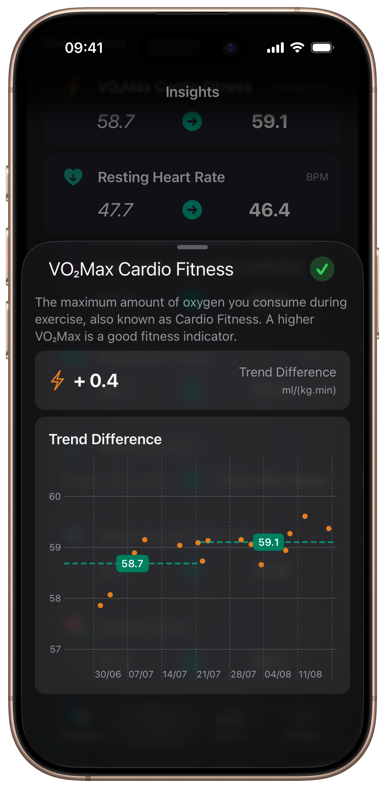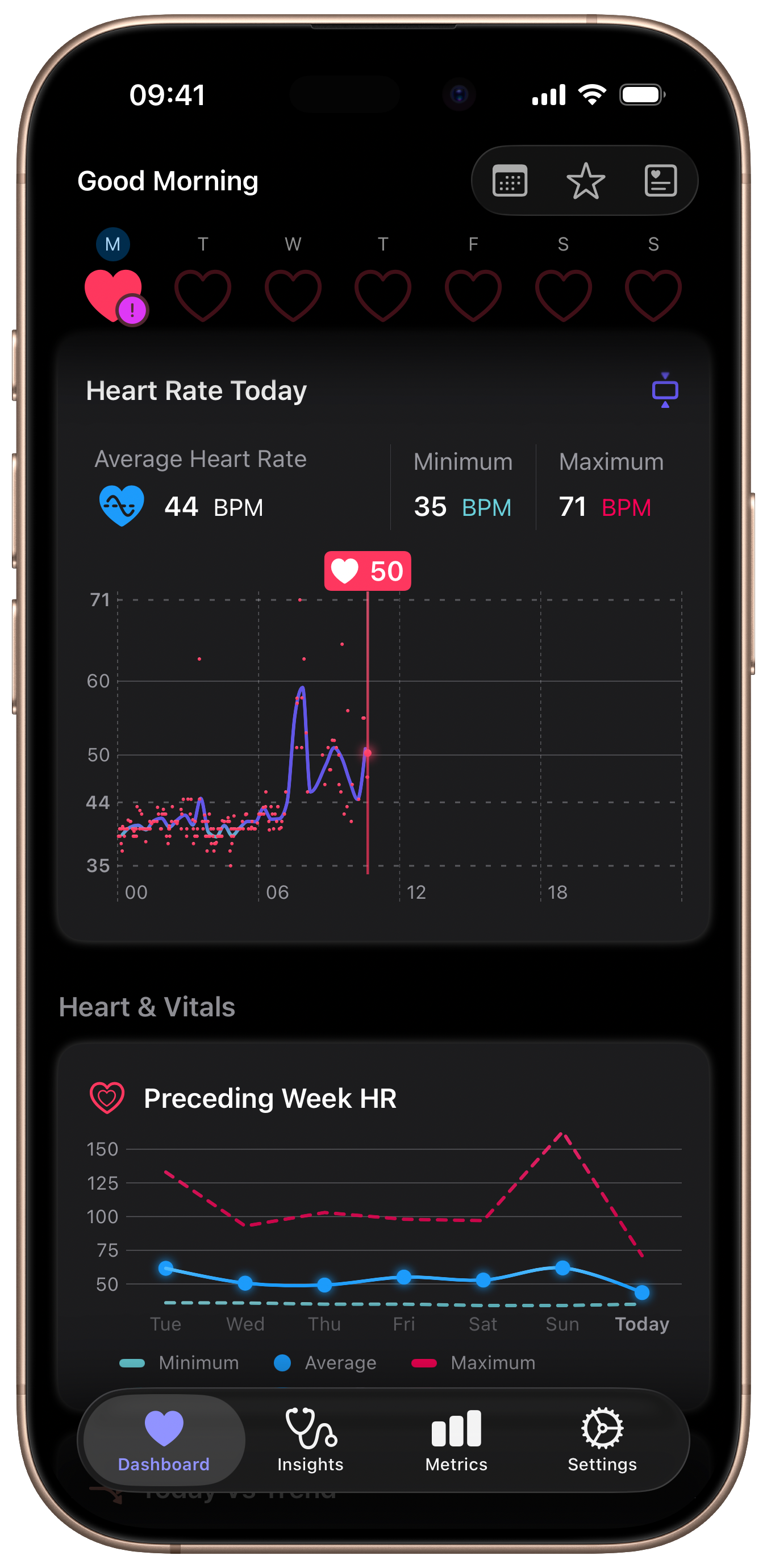 Get concise, relevant metrics with clear trend indications right at a glance. You can also generate PDF Heart Reports for exporting and sharing.