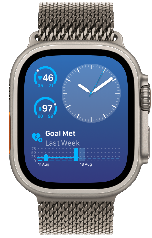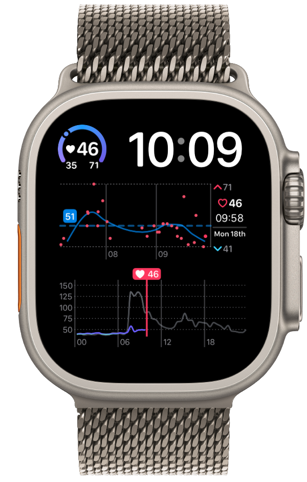 Updated for WatchOS 26, swipe through Heart Rate metrics, browse charts for the week or take a LiveHR reading for a full summary at any time.