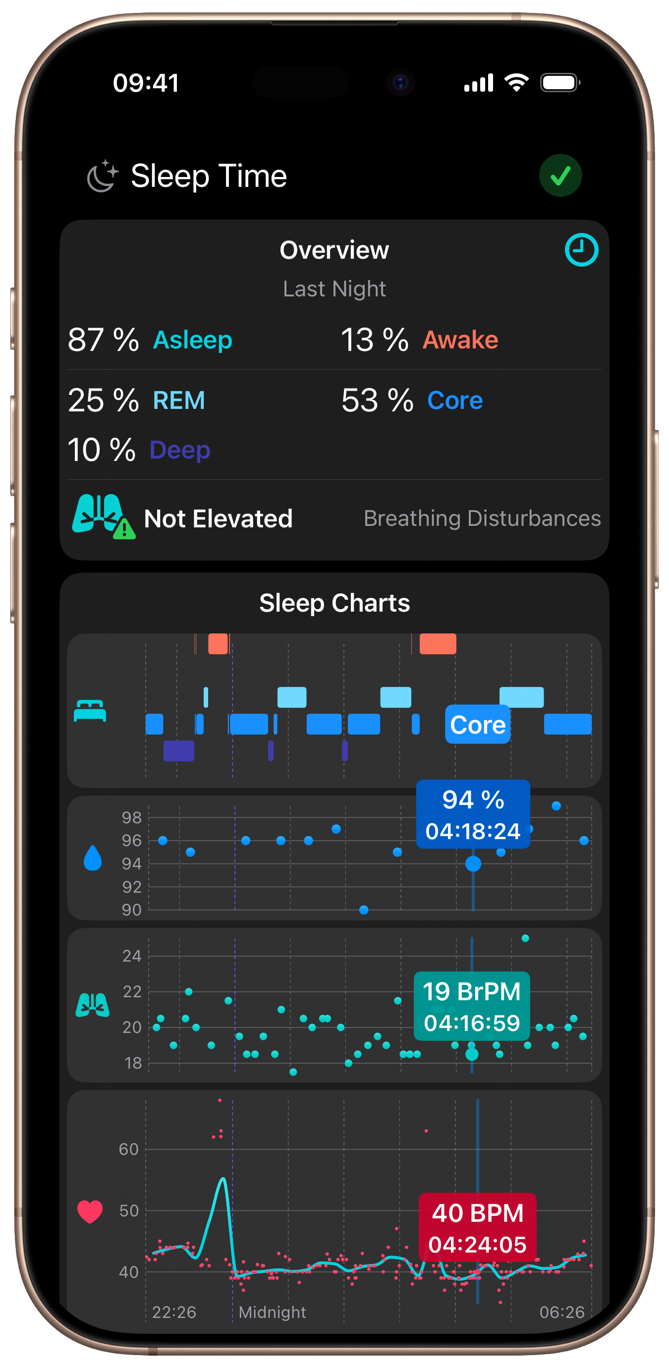 Whether you want to view recent Heart Rate metrics or dive into four years of data, it’s all there for you to see. With so many charts, identifying trends has never been so easy. Advanced features such as Breathing Disturbance tracking, HRV (rMSSD) and Custom Heart Rate Zones let you drill down into your data.
